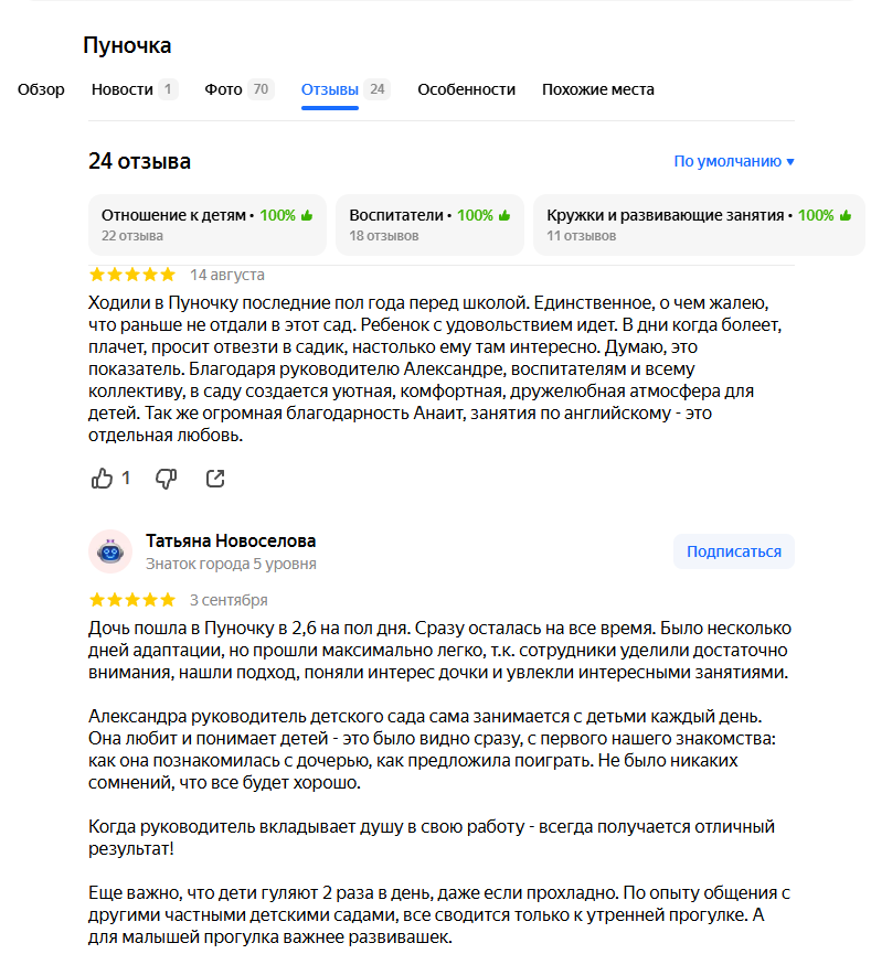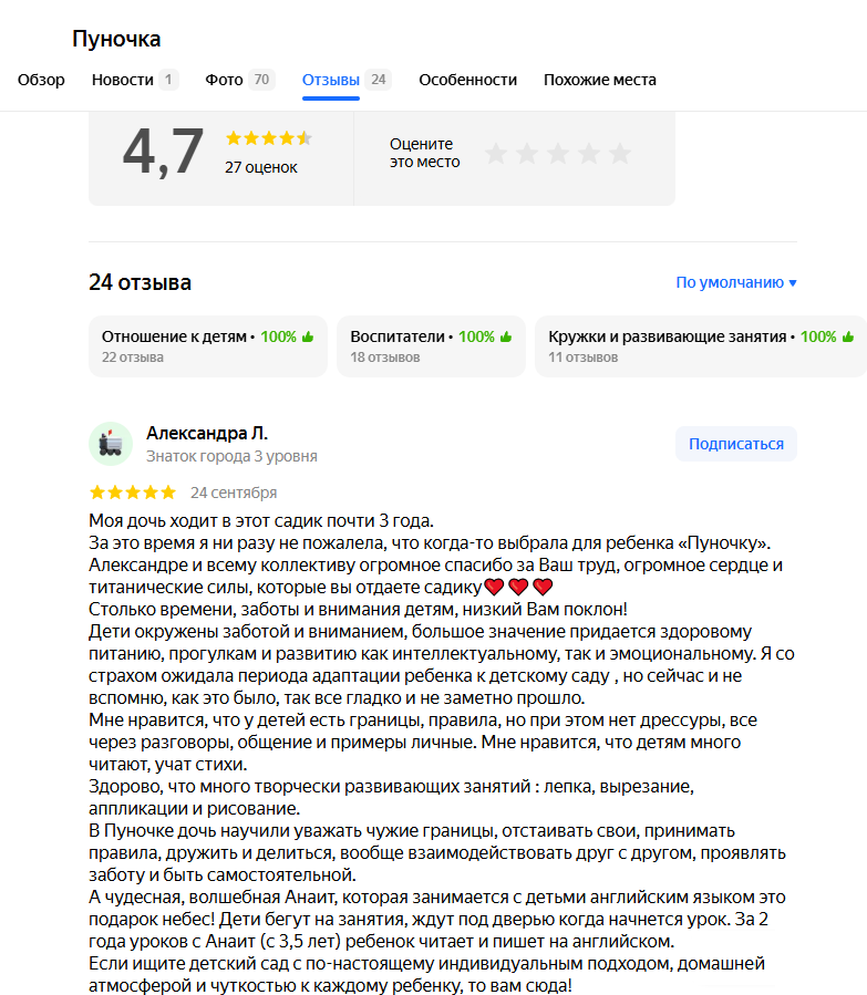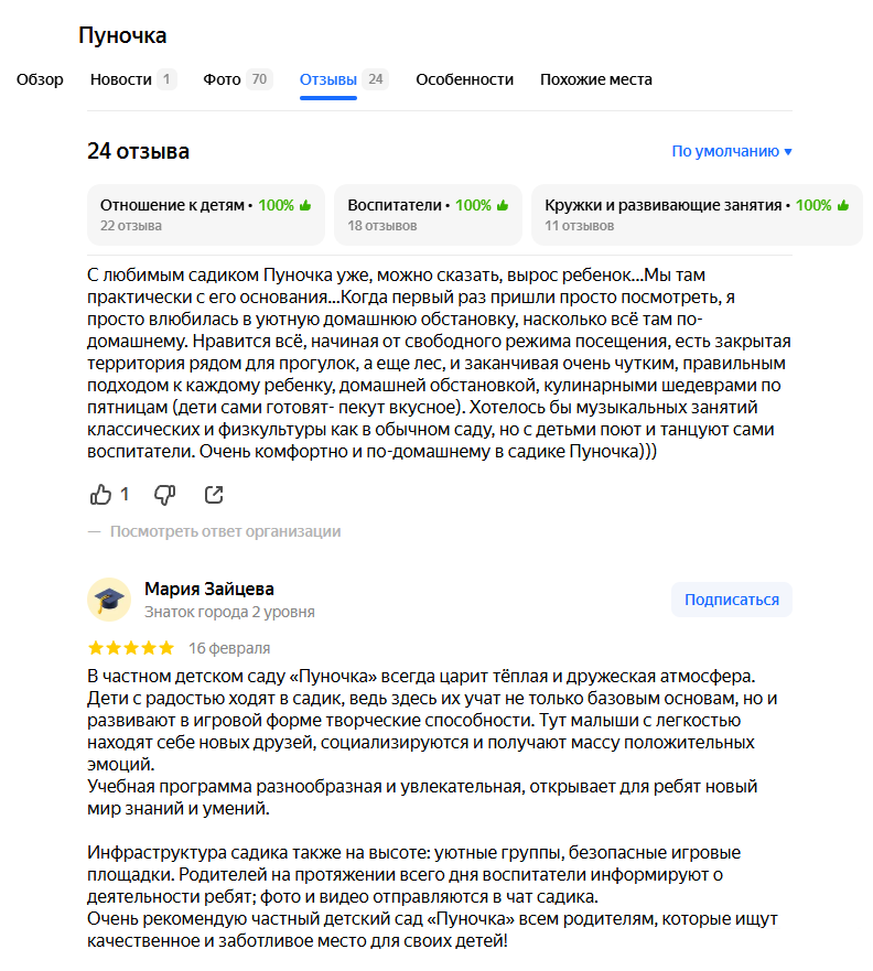 «Мы создали садик, о котором мечтали для своих детей. Здесь царит любовь, забота и все, что нужно для счастливого детства, поэтому у нас каждый ребёнок чувствует себя как дома. Наш детский сад расположен в тихом месте рядом с лесом, вдали от городской суеты, где дети играют и отдыхают на свежем воздухе. Мы уделяем особое внимание всестороннему развитию личности и социальному интеллекту ребенка»